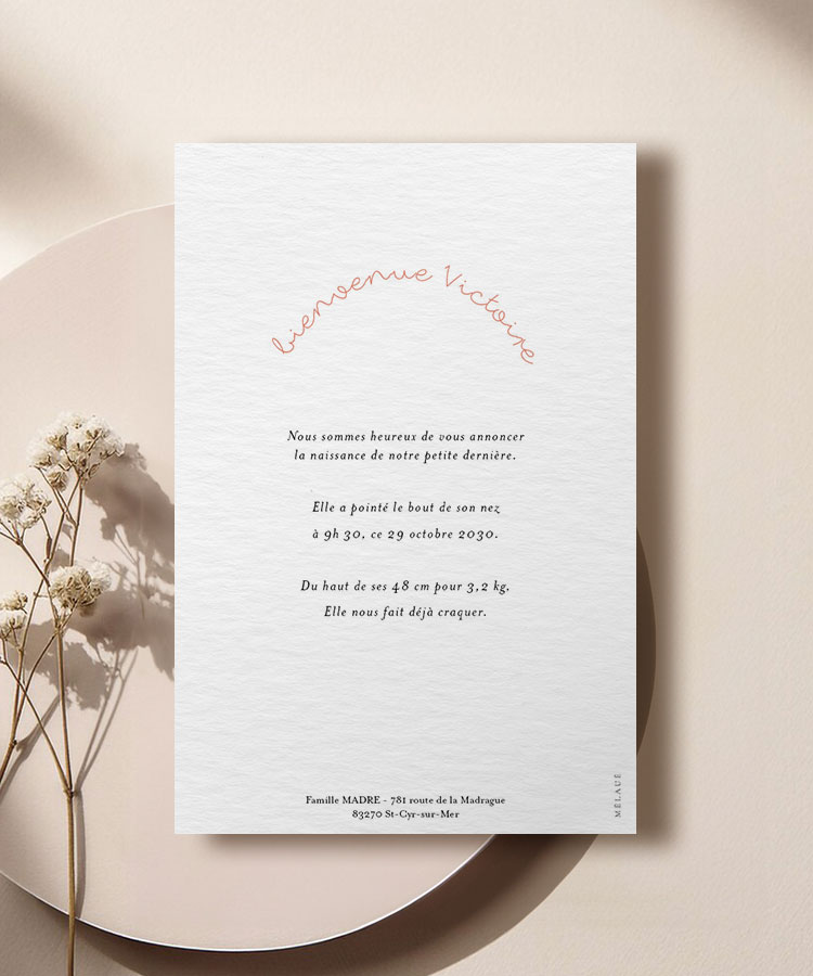 Imprimée sur un papier de qualité de création à l'aspect texturé, cette carte rectangulaire offre une belle surface pour une mise en page soignée. L’arrondi des coins ajoute une touche de douceur supplémentaire à l’ensemble et reste au choix. Tandis que l'alternance harmonieuse entre <u>typographie manuscrite et linéale souligne le prénom</u> et les détails de la naissance avec style.